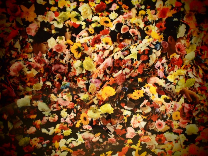 生花の転写プリントのスーツに身を包んで、だまし絵的な!!
