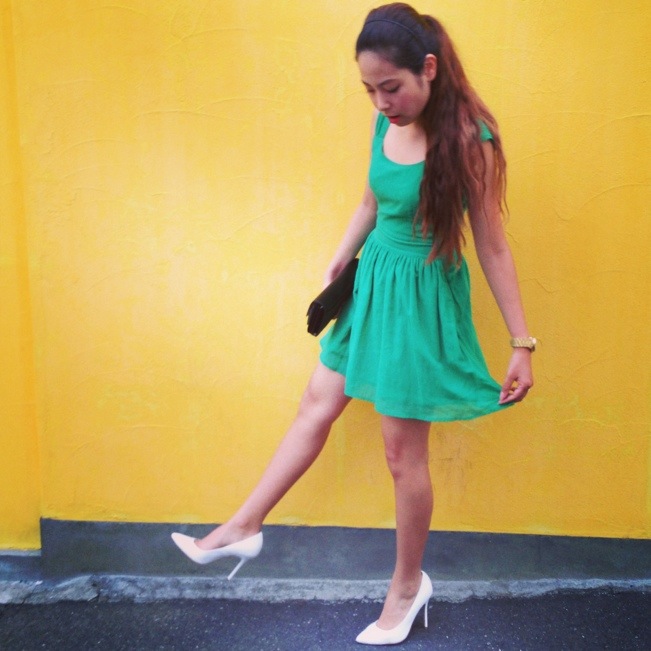だから、白のポインテッドで女らしいパンプスに、女らしい赤リップで、