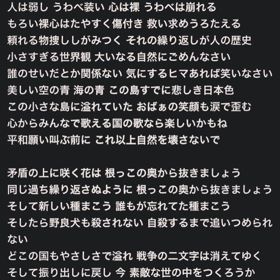 戦争地だった沖縄だからこそ、見えるもの・感じるものがあって、それを世界に知ってほしいって、今の子供達に知って欲しいって言ってるように聞こえた歌。