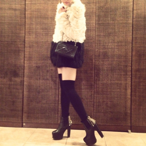 snidelのバイカラーファーコートとスタッズブーツで反抗してみたり。笑
