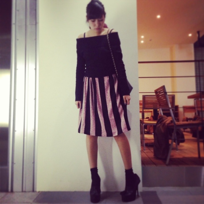 今回は一緒に届いたスナイデルのピンクのストライプのひざ丈フレアスカートとコーディネート♪♪